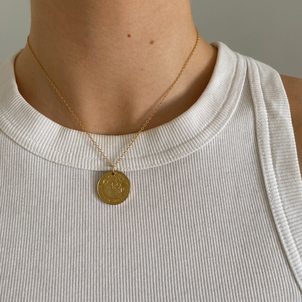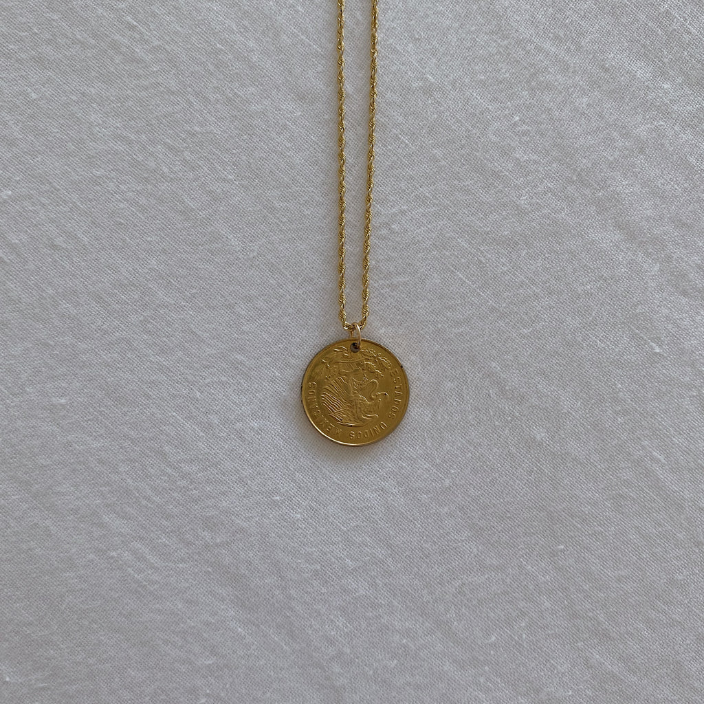 Hand-assembled from a charm bracelet I found in an antique store in upstate New York, these coin necklaces perfectly balance vintage intrigue and modern quality. Each coin is from the 1950s, made in a durable gold plating with only slight signs of wear. Available on a 1.5mm wide, 16" long 14k gold filled cable chain.